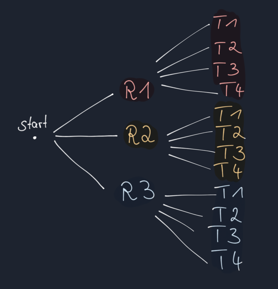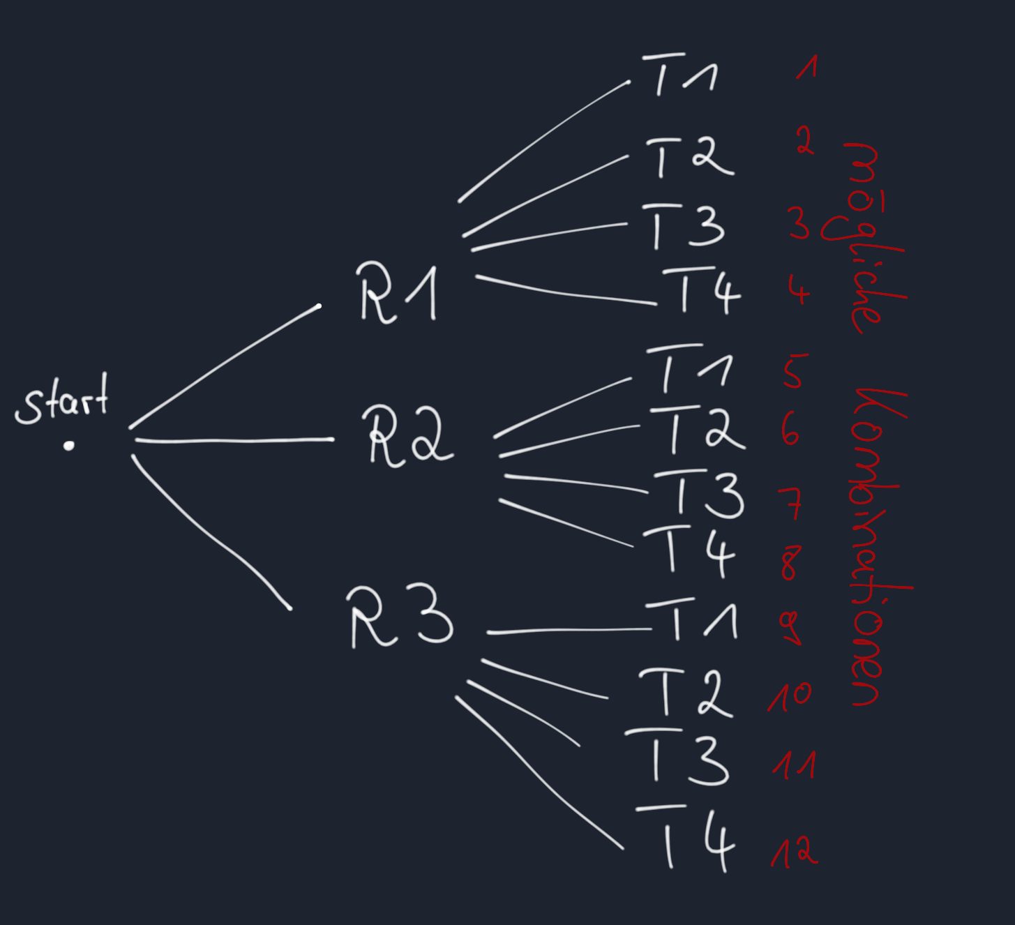 In Klaras Kleiderschrank liegen vier Tops (T) und drei Röcke (R). Welche Möglichkeiten hat Klara, die Tops und Röcke zu kombinieren?